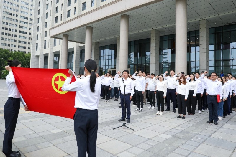 活动现场,集团33家二级单位团组织的100余名青年整齐列队,在集团大楼东门举行庄严的升国旗仪式,伴随着高昂的国歌声响起,五星红旗在朝阳之下徐徐升起,全体人员行注目礼。